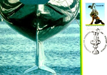 Auf dieser Postkarte sehen wir den revolutionären Flügelkiel der 'Australia II',