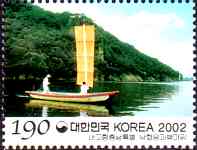 Korea, ein Satz mit 16 Doppelmarken, darunter dieses lokale Ruder- /Segelboot.