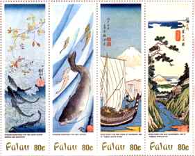 Palau, ein Block mit vier Marken, Thema 'Masterpieces of Japanese Art, Wood Block