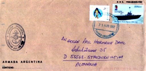NAVAL). Da er ins Ausland adressiert war, wurde er mit argentinischen Postwertzeichen versehen und