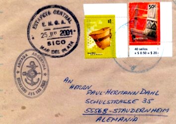 Der Brief trägt einen Poststempel des Marinepostamtes vom 25. Juli 2001 aus MAR DEL PLATA (CORRERO
