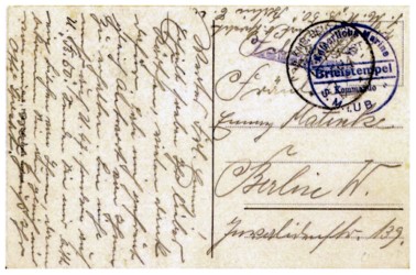 ZENSURIERT, sowie der Posteingangszensur des Marinepostamtes Berlin C 2 (Rückseite), ebenfalls von UB 50.