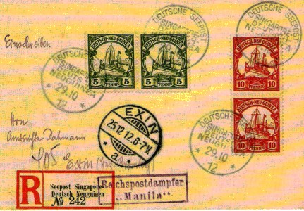 Zwischen 1909 und 1914 wurden die Stempel "Deutsche Seepost Deutsch - Neuguinea - Singapore" und