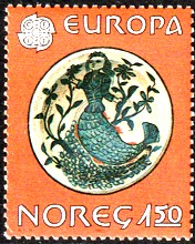 Ran ist die Frau des Meergottes Ägir. Auf der Marke links ist Ran mit einem Netz auf der Suche nach