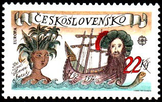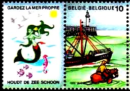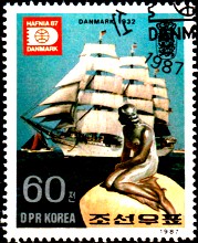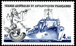 Auf der linken Marke sehen wir neben dem Polarschiff "Jules Verne" eine Meerjungfrau, die einen Hammer schwingt.