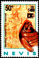 Auf dieser Nevis Marke steht: Robbe, die fälschlicherweise für eine Meerjungfrau gehalten wurde.
