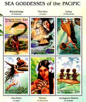 Tien-Hou von China leuchtet Schiffern im Sturm mit einer Laterne und Lorop von Micronesien taucht nach Fischen.