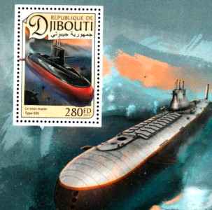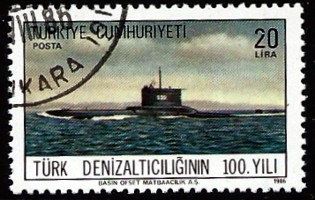 Auf diesem Block ist ein Uboot mit mehreren Klappen an Deck abgebildet.